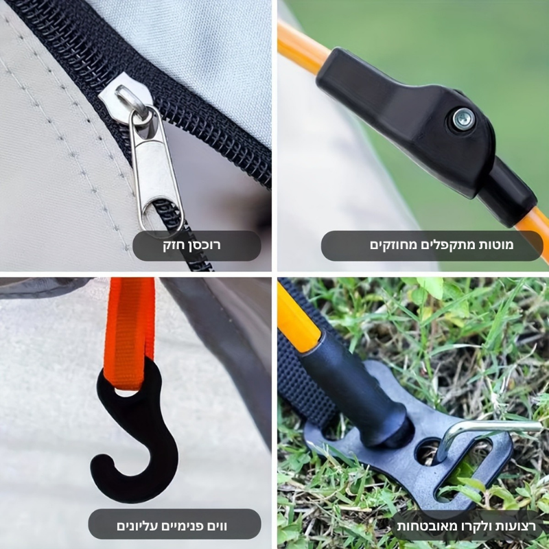 כולל מוטות קשיחים, ווי תלייה פנימיים, רוכסן חזק ורצועות ולקרו לתפיסה מלאה לקרקע.